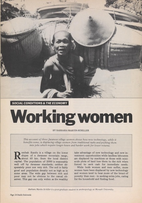 In her article, ‘Working Women’, published in the very first issue of Inside Indonesia in 1983, Barbara Martin-Schiller recounts the story of Riati, a young woman from a Javanese village named Rembah Randu, who moved to Jakarta. Riati's move reflected the larger social changes driven by the influx of new technology and capital. She initially found employment as a servant with a family in Jakarta. Then, compelled by the experiences of friends working in clothing factories, she returned to her village to take sewing lessons. The allure of better pay and more freedom was strong. Riati envisioned a return to Jakarta, possibly seeking employment in a clothing factory, or establishing her own sewing business.