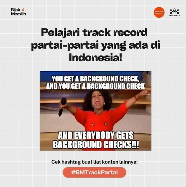 Organisations like Bijak Memilih use social media in clever ways to reach out to and educate young, including many first time, voters / IG @bijakmemilih