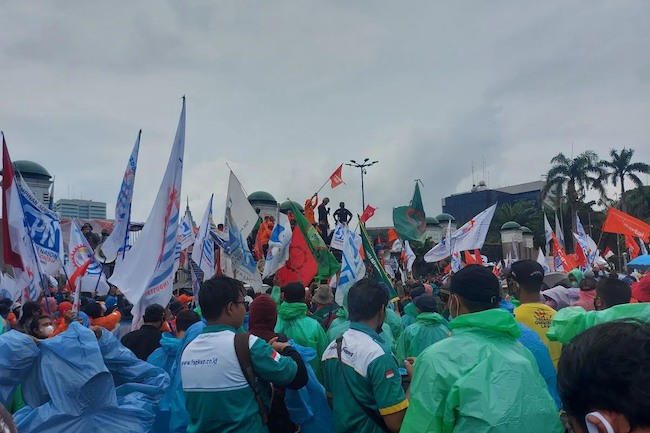 Thousands of workers stage a rally against the omnibus law on Job Creation in front of the Parliament (DPR) Building, Jakarta, 14 Jan 2022 / ANTARA/MENTARI DWI GAYATI