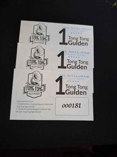At Tong-Tong Night Market history is presented as heritage, that is, remnants of the past that continue to exist around us. Icons of heritage were scattered throughout the market: traditional snacks; a corner for traditional games; a performer on stilts; a band wearing traditional attire and Javanese headwear, and two antique cars exhibited in the middle of the park behind barriers. Remarkably for this event, visitors had to make transactions using ‘gulden’ vouchers. The gulden, or guilder in English, was the currency used in the Dutch East Indies. In the night market, one gulden was valued at Rp.8000 (approximately A$0.80). The market did not accept transactions in rupiah, only in gulden. The organisers referred to this use of heritage as an effort to ‘return to the past’.