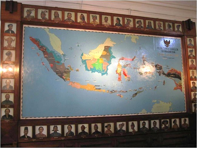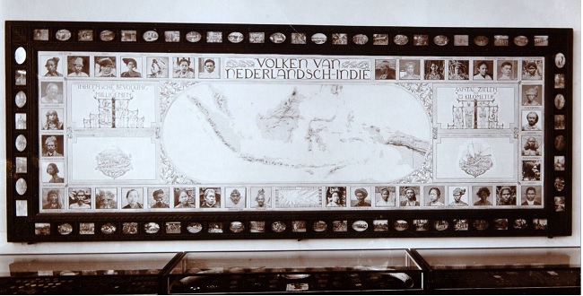 Although Pirngadie’s original work was destroyed in a fire at the Dutch Pavilion, another version of this map has been and still is on display at Museum Nasional in Jakarta since 1935. Just short of a century this map of ‘ethnic groups’ is exhibited without accompanying historical information or any other contextualisation up until this day. An informative video on the 2018 restoration of the map, explains to the viewer that the map is a representation of ‘the accessories and facial characteristics of ethnic groups,’ an explanation that confirms, continues and re-authorises colonial racial classifications of people and geographical regions to museum visitors today.