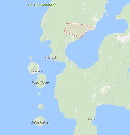 Makian Island (bottom left) and Malifut (area shaded in red). (Map data by Google)